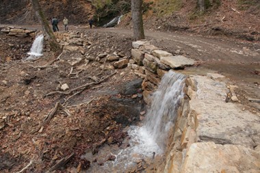 En las vías principales es más probable que se realicen inversiones de mejora como aporte de material, construcción de escolleras o muros krainer, etc. En estas pistas generales los badenes son, como en las secundarias, de tierra, pero cuando es necesario se les echa piedra para mejorar su funcionalidad y duración, e incluso a veces se construyen de hormigón. Antes se hacían de hormigón armado pero ahora en general no se emplea mallazo sino que se añade fibra. Además de la categoría de las pistas, las mejoras que se hacen son función de la capacidad de invertir en cada monte en concreto, ya que algunos, gracias a los ingresos en los fondos de mejora, disponen de más recursos económicos.