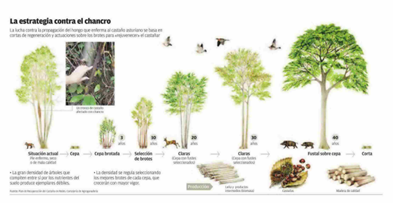 El Servicio de Gestión Forestal del Principado de Asturias ha implantado un plan de recuperación mediante cortas de regeneración en los montes públicos afectados. Estas cortas permiten eliminar los pies afectados, mientras se respetan especies acompañantes como robles o abedules, facilitando el rebrote natural del castaño desde la cepa madre. En Vega de Cobo y Peña de Rosques, la intervención cubrió casi 79 hectáreas, con el objetivo de regular la densidad tras cuatro o cinco años, favoreciendo así brotes de mayor vigor.