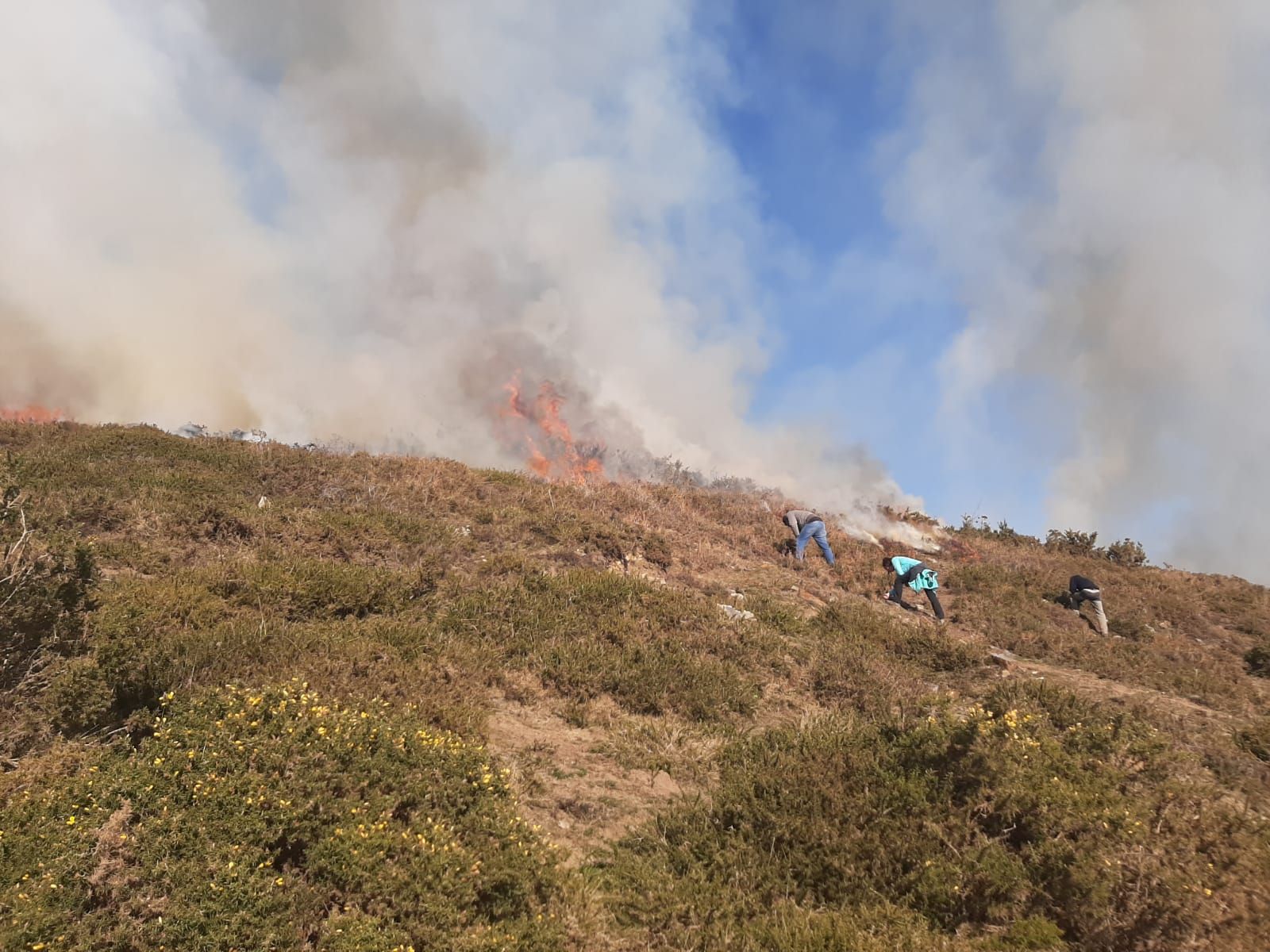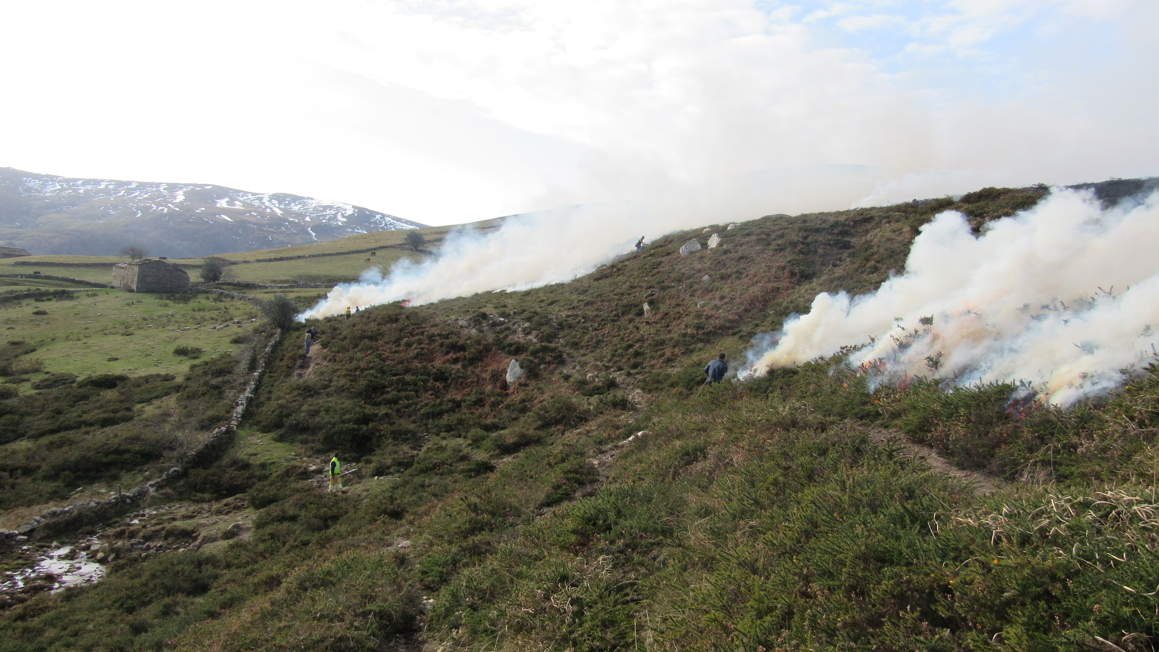 1. Campo Arroya (Luena) MUP 374 y Sel de Ayuso (San Pedro del Romeral) MUP 381. Ambas parcelas, con objetivos de reducción de riesgo y regeneración de pastos, fueron autorizadas como quema simplificada. En Campo Arroya, la vegetación principal era Ulex sp. (60% de cobertura) y Gramíneas sobre una pendiente media del 23%. La técnica consistía en crear una línea negra inicial contra el viento/pendiente, cerrando progresivamente los bordes.