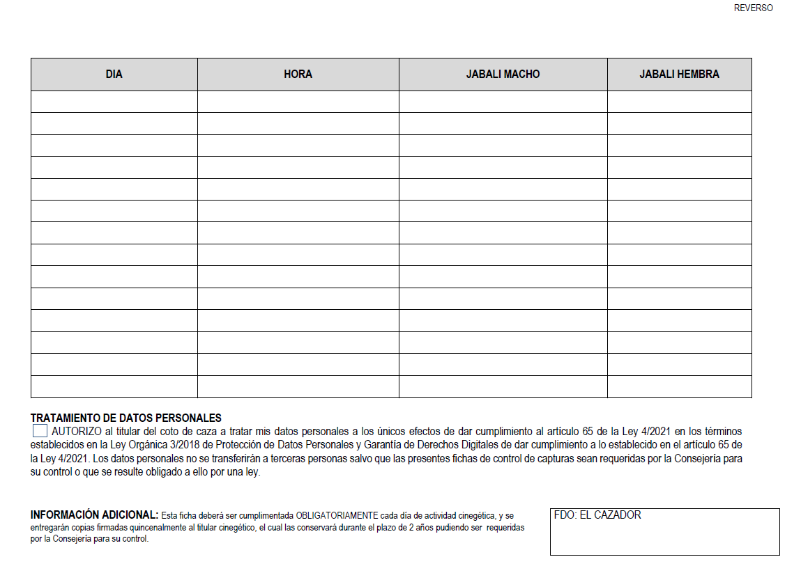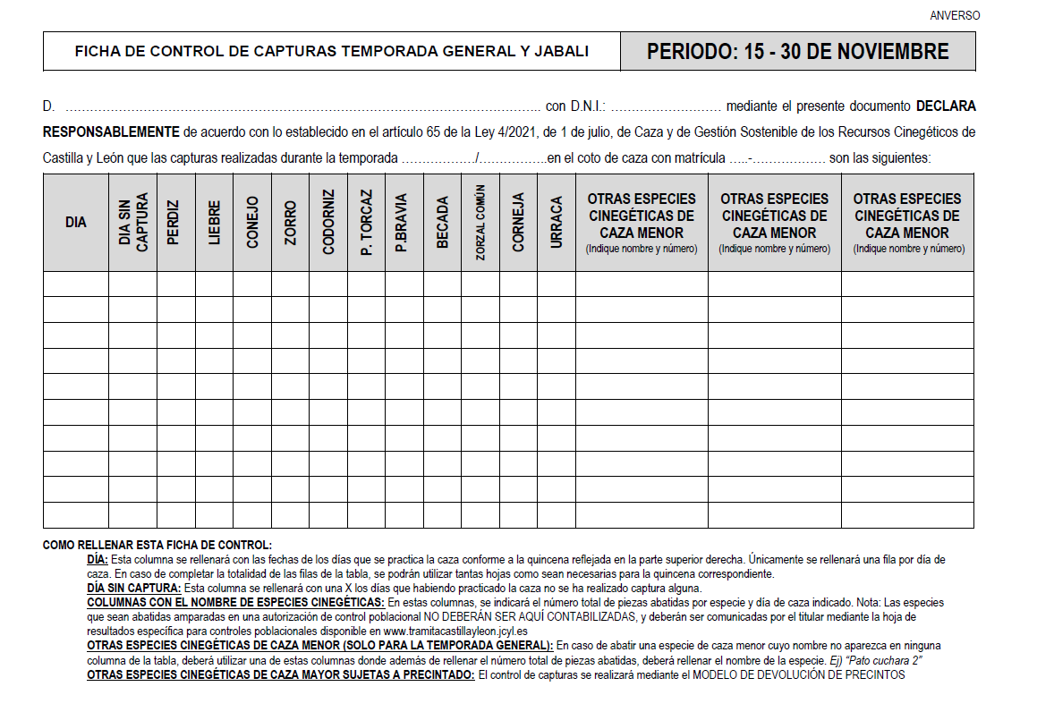 “CapturCyL” es un sistema automático de control de cupos de caza cuyo objetivo principal es reportar las capturas en tiempo real. Hasta el momento su utilización no es obligatoria, y los datos pueden recogerse en papel, reportándose a la administración en un periodo quincenal. El impreso que se rellena actualmente es el siguiente: