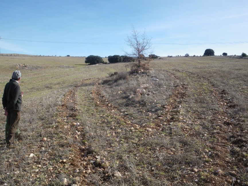 Aparte de zonas de más amplitud, destacan lo que hemos denominado “ojales”: muy pequeñas zonas plantadas alrededor de montones de piedras o encinas que permanecían dentro de los cultivos, compuestos por no más de dos o tres filas de plantas dispuestas en forma alargada paralela a las besanas, de manera que apenas restan superficie al cultivo agrícola y no lo entorpecen, y suponen sin embargo un importante refugio para la fauna, así como obstáculos a la escorrentía.