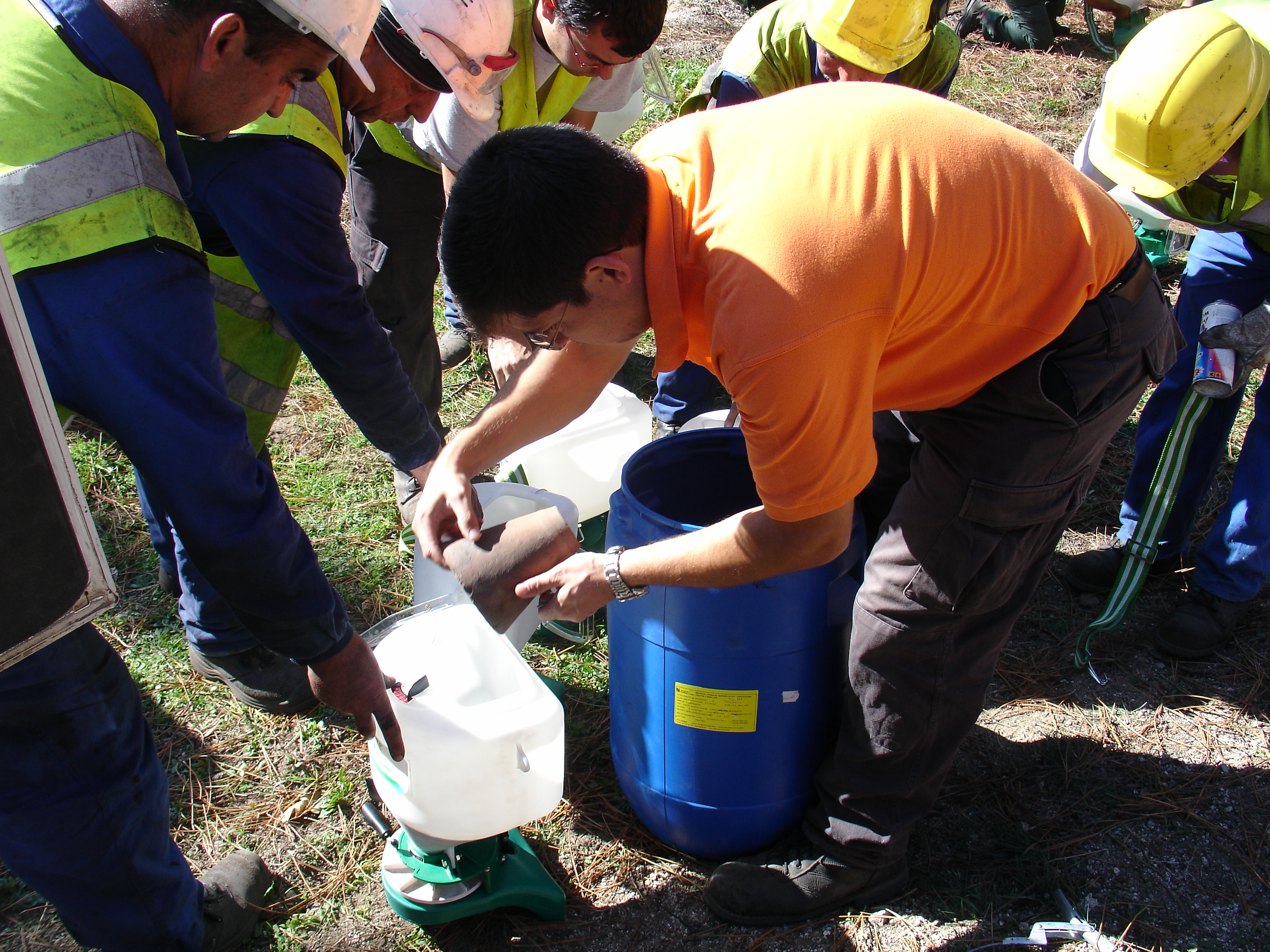 - Para calcular la posición correcta del dosificador, se realizaron pruebas sobre un plástico de dimensiones determinadas (20 metros de largo por 8 metros de ancho) en un antiguo sequero. Las dimensiones del plástico permitieron que el operario realizara varias pasadas paralelas, simulando la labor en el monte.