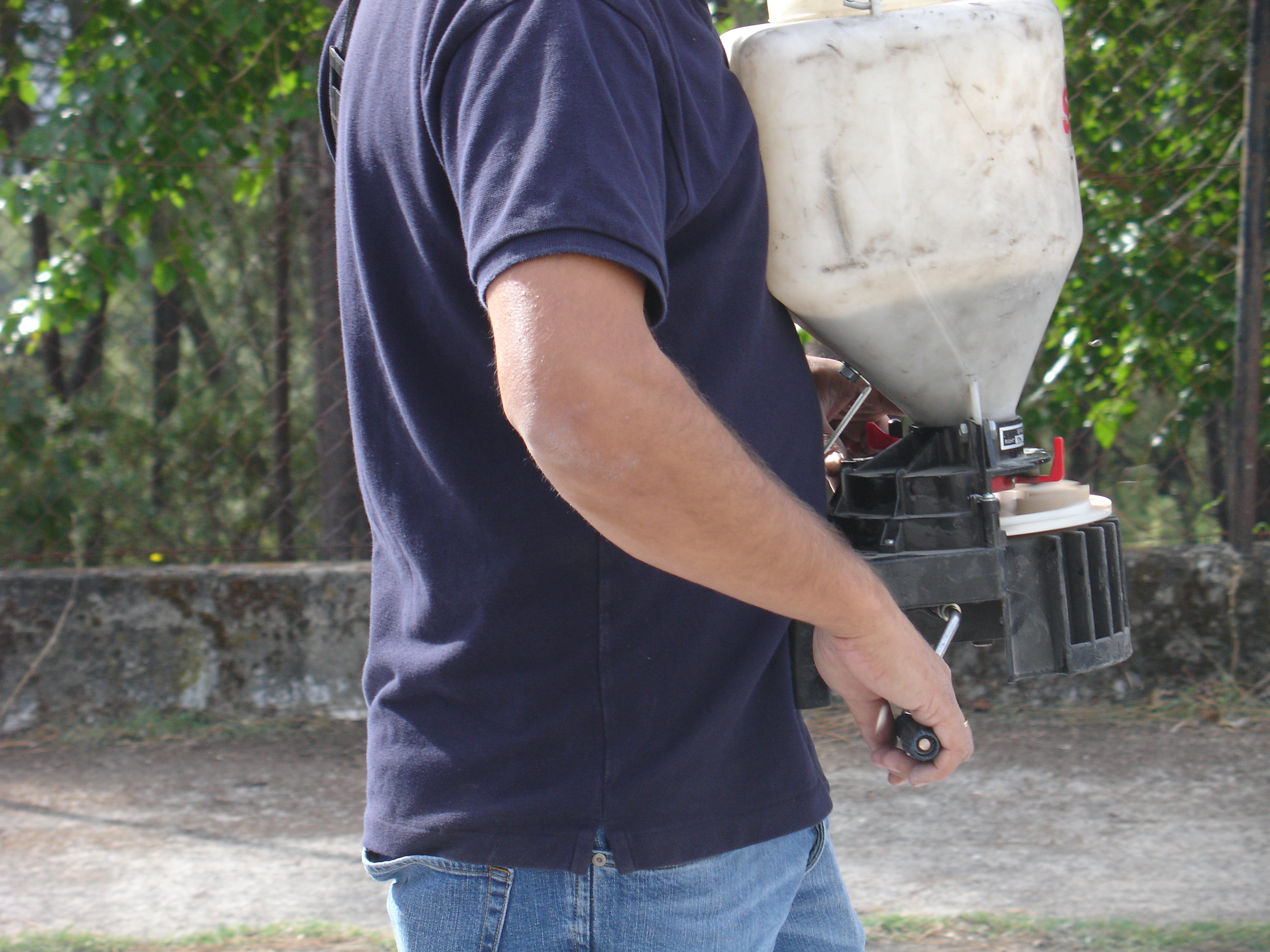 - El operario simulaba pasadas, se pesaban los piñones dispersados y se calculaban los kg/superficie para ajustar el dosificador y establecer la dosis operativa (2,5 a 4 kg/ha).