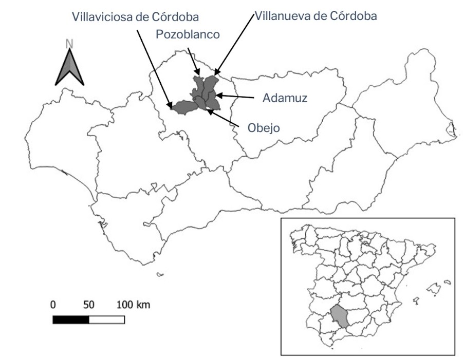 El hábitat de estudio está constituido por encinares adehesados (Quercus ilex L.) caracterizados por una Fracción de Cabida Cubierta (FCC) entre 5% y 20%. La zona de estudio se delimitó en la parte oriental del Valle de Los Pedroches, Córdoba, incluyendo los municipios de Adamuz, Obejo, Pozoblanco, Villanueva de Córdoba y Villaviciosa de Córdoba. Se seleccionó esta área de 177,5 km² con el fin de asegurar una diversidad topográfica suficiente para investigar la influencia de las variables geomorfológicas locales (como pendiente, orientación, y altitud) en el desarrollo estructural de los árboles individuales. Cabe destacar que, si bien la acción humana (podas) y el ramoneo del ganado modelan las copas, el estudio se focaliza en detectar la influencia de estos factores ambientales locales subyacentes en el tamaño y forma de las copas.