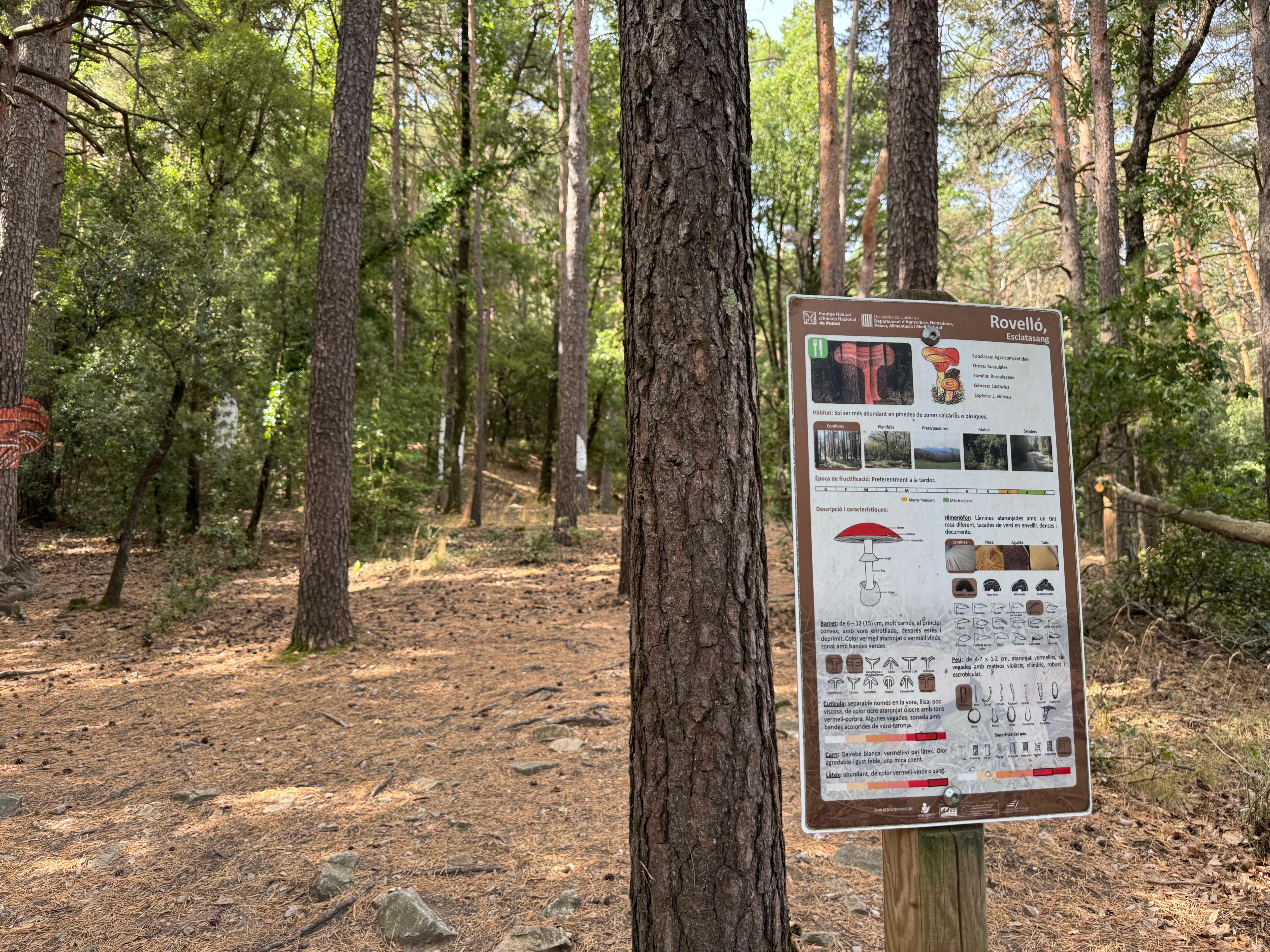 Figura nº3: Imagen donde se aprecia parte del itinerario micológico en el Paraje Natural de Poblet (Cataluña), centrada en la composición de los carteles con información para los visitantes. Año 2025. (Fuente: REMP).