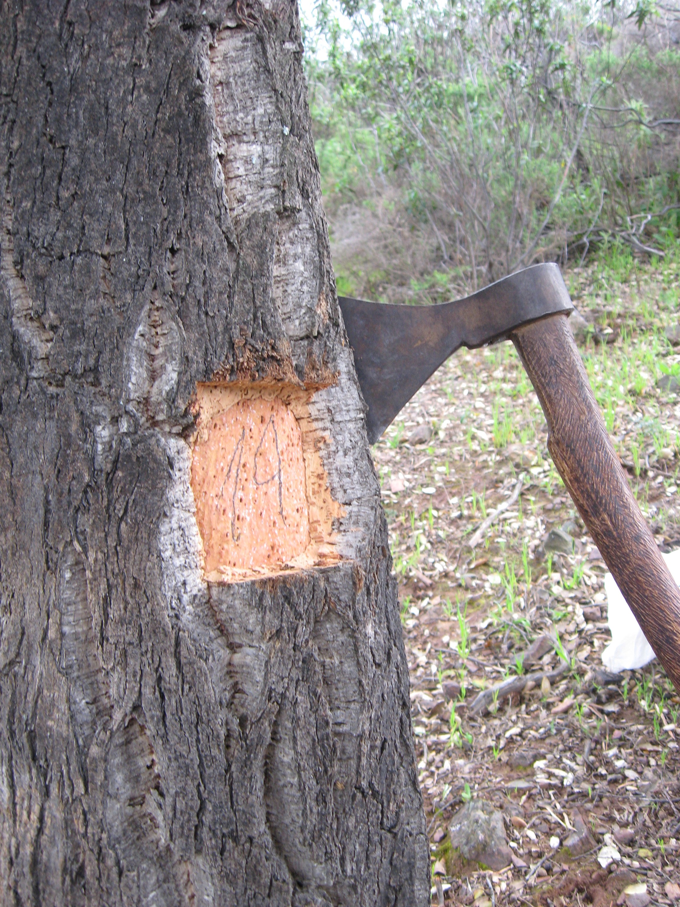 1. Muestreo en campo: Personal técnico especializado del Servicio del Alcornocal y del Corcho de Andalucía (SACA) extrae "calas" representativas en los montes antes del descorche, sin dañar los árboles.