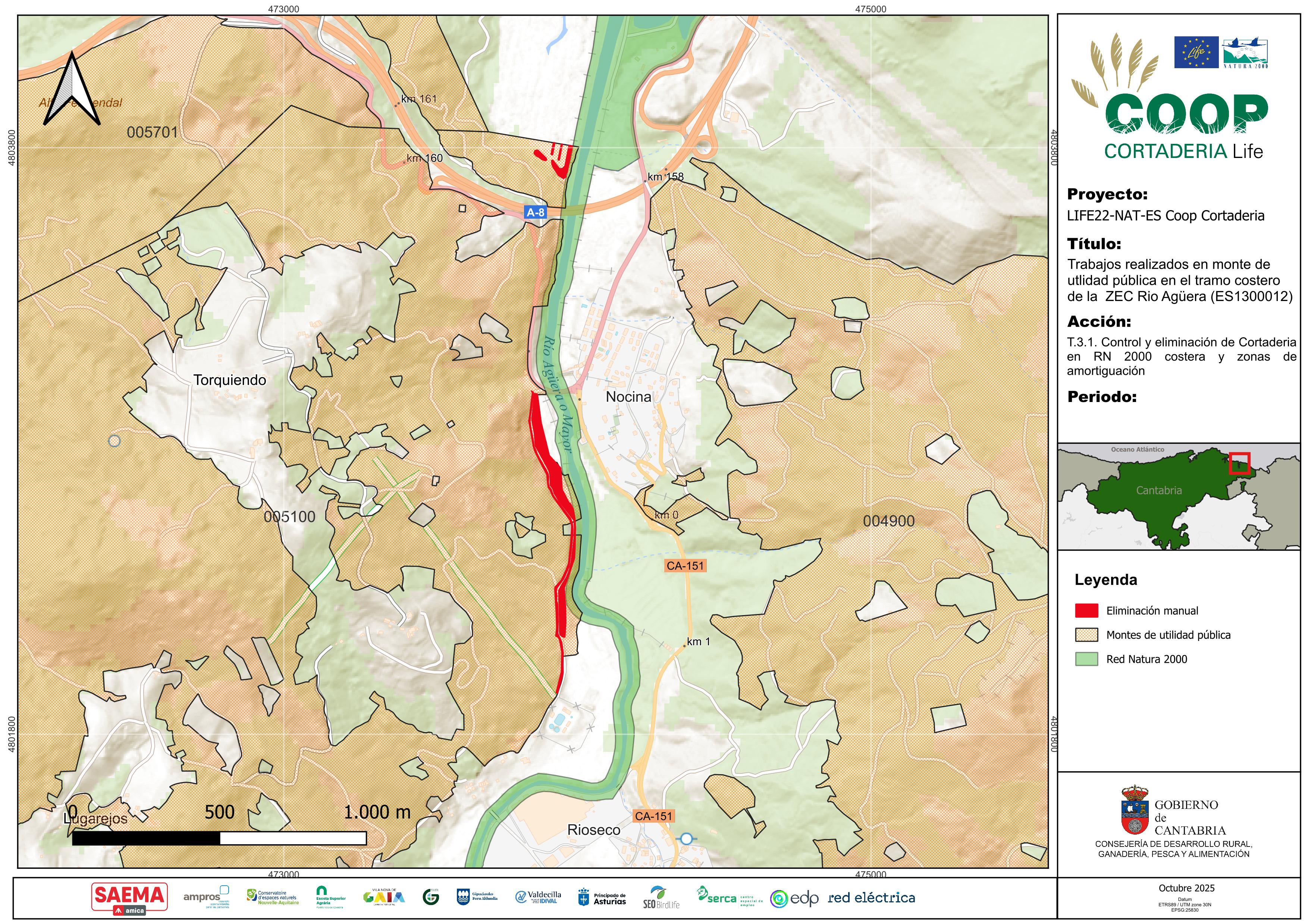 De manera particular, las acciones de control se han extendido a los Montes de Utilidad Pública (MUP) a través de proyectos posteriores como el LIFE Coop Cortaderia (2023-2028). Un ejemplo de esta intervención es el Monte Arza (MUP 51), ubicado en el municipio de Guriezo, donde se consiguió eliminar Cortaderia selloana en una superficie de 2,66 hectáreas.