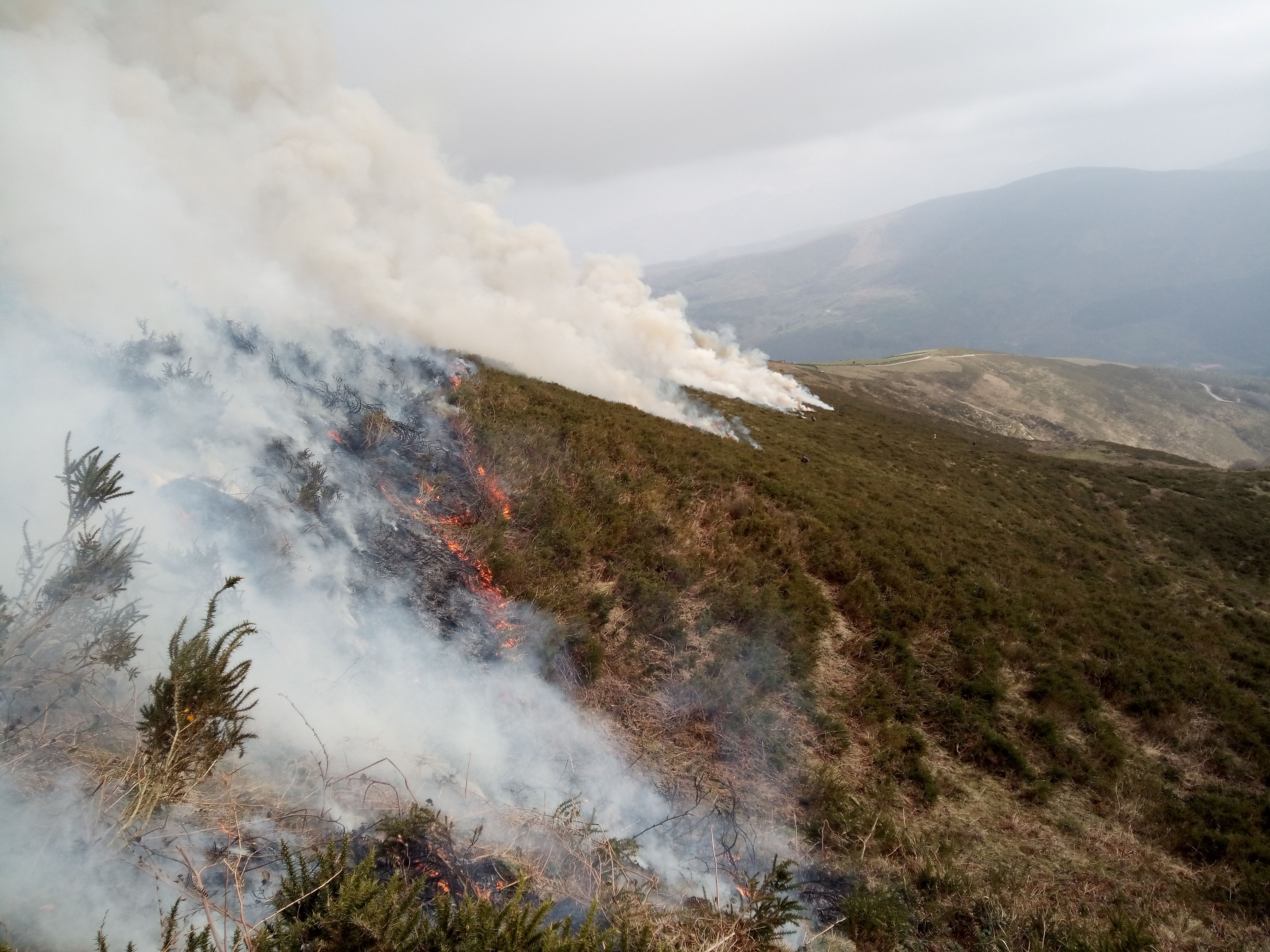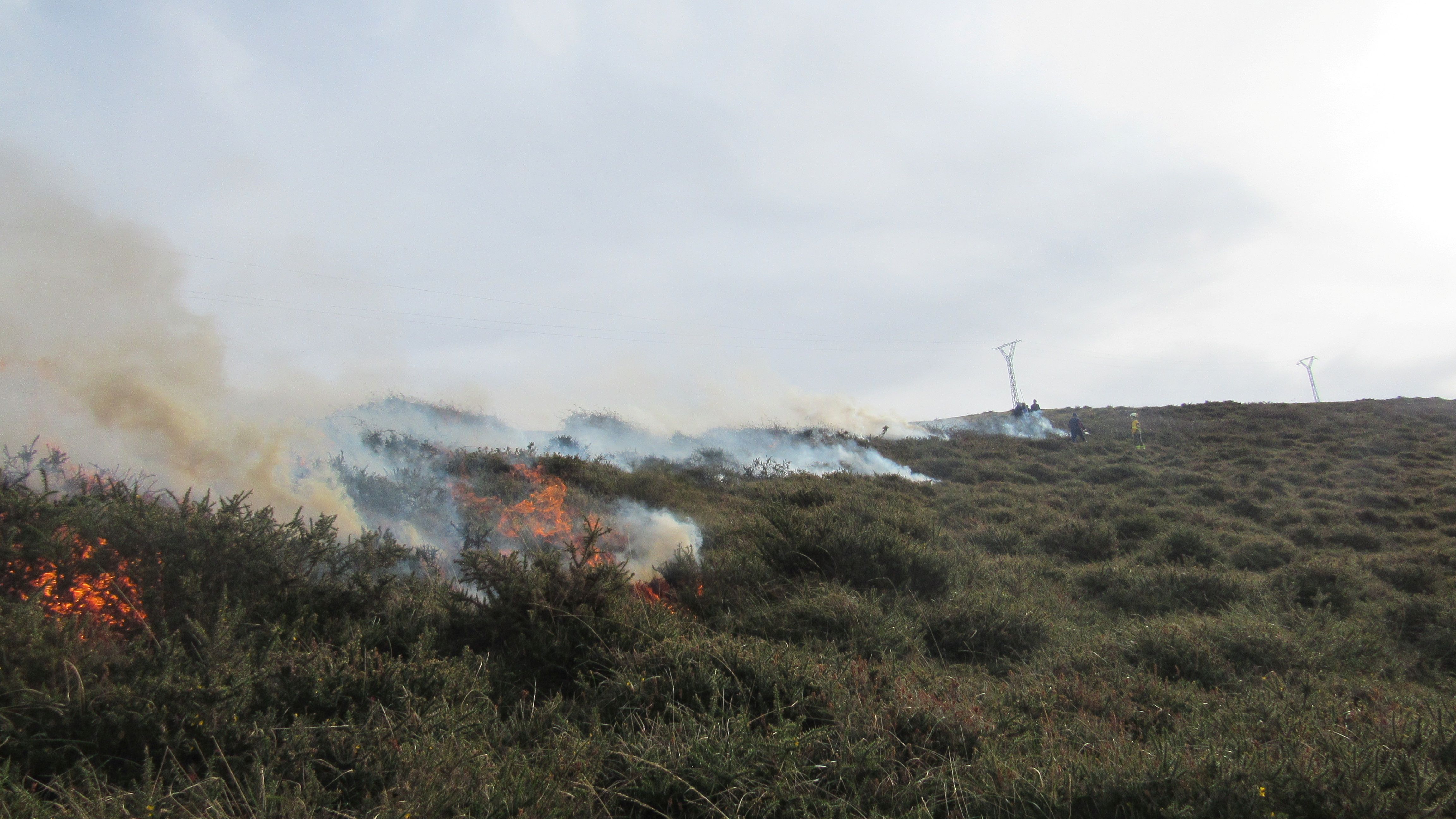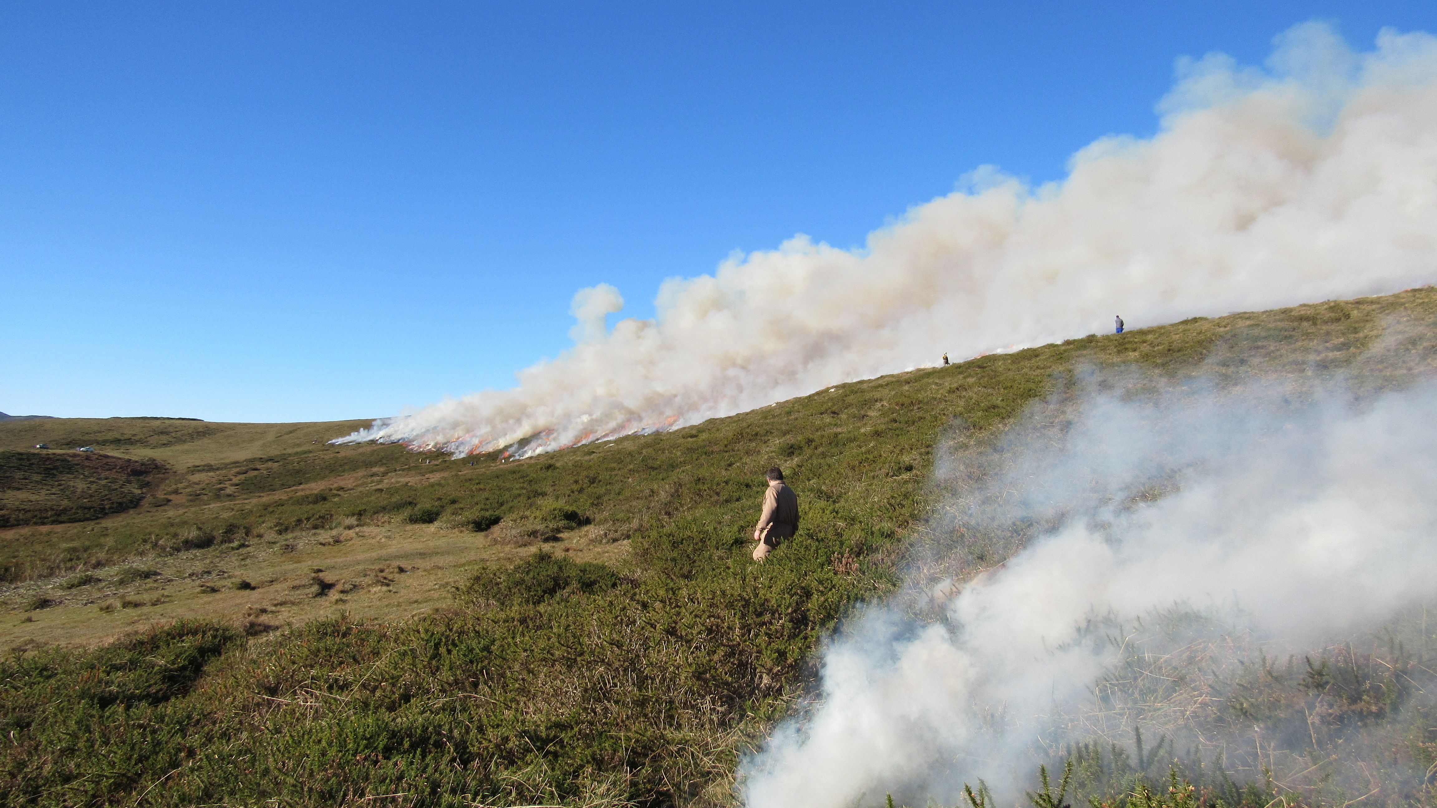 1. Campo Arroya (Luena) MUP 374 y Sel de Ayuso (San Pedro del Romeral) MUP 381. Ambas parcelas, con objetivos de reducción de riesgo y regeneración de pastos, fueron autorizadas como quema simplificada. En Campo Arroya, la vegetación principal era Ulex sp. (60% de cobertura) y Gramíneas sobre una pendiente media del 23%. La técnica consistía en crear una línea negra inicial contra el viento/pendiente, cerrando progresivamente los bordes.